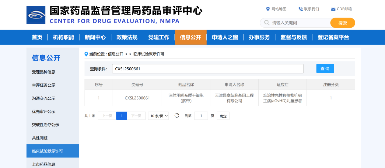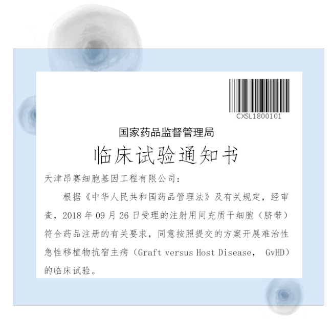 2025年11月3日, 天津昂賽細胞基因工程有限公司申報的注射用間充質(zhì)干細胞(臍帶)治療難治性急性移植物抗宿主病(aGvHD)兒童患者的適應(yīng)癥獲得國家藥品監(jiān)督管理局臨床試驗?zāi)驹S可